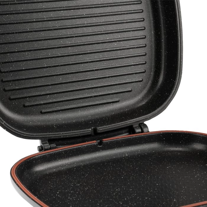 این تابه با طراحی دو طرفه خود، امکان پخت غذا بدون نیاز به استفاده زیاد از روغن را فراهم میکند و برای کسانی که به دنبال رژیم غذایی سالمتر هستند، مناسب است.